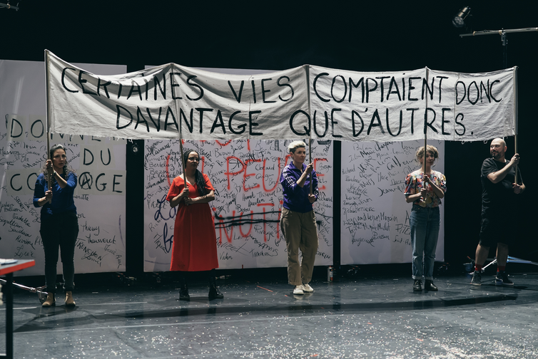 14 juillet, adaptation d'un roman portant le même titre, revient sur un épisode fondateur de notre légende républicaine mais à hauteur de peuple. Il s'agit de revenir sur l'enchaînement de quelques faits et d'en déployer l'imaginaire en écho à notre monde contemporain : un mur couvert de noms oubliés, un pont de planches...