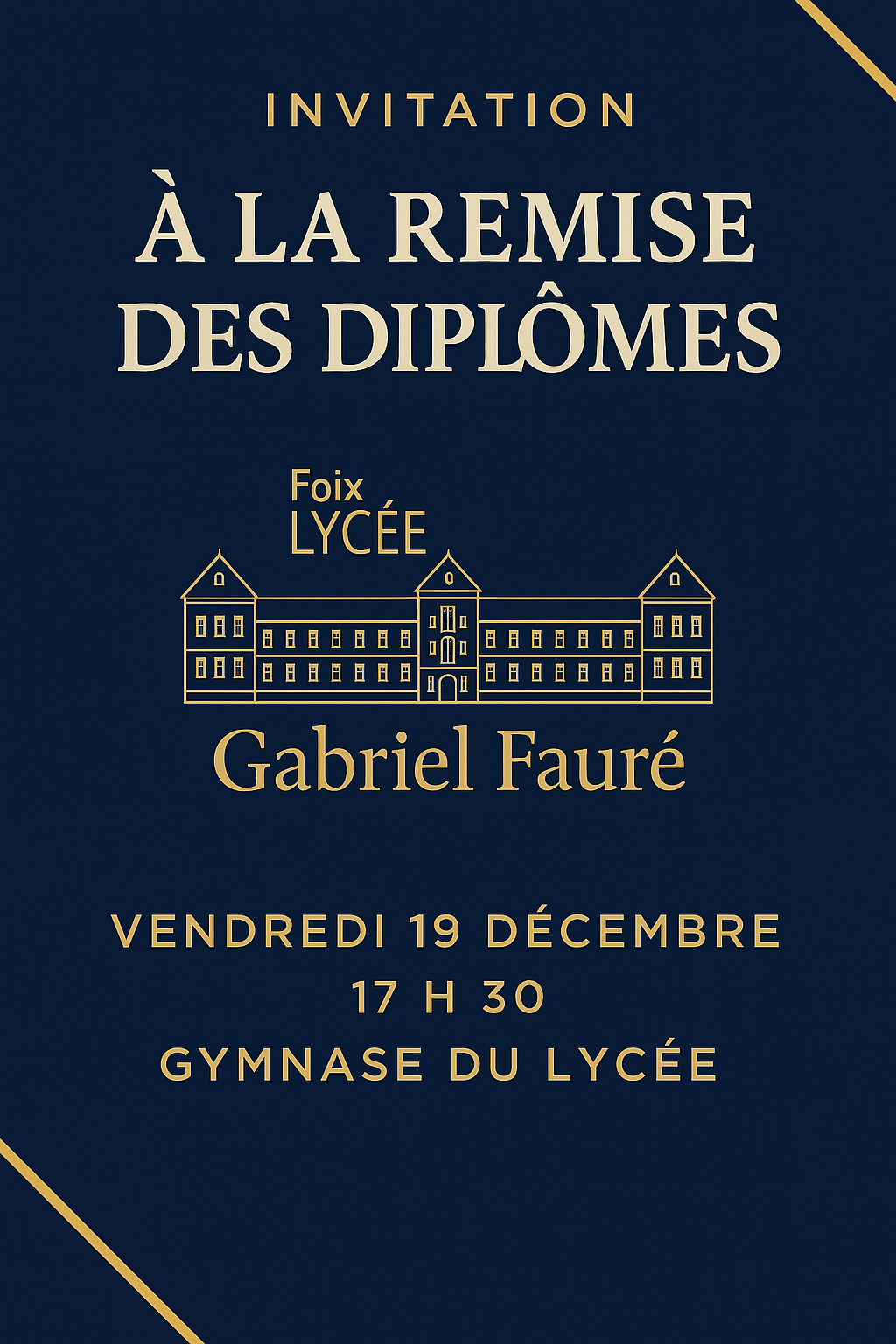 J'ai l'honneur de vous inviter à participer à la cérémonie des diplômes qui aura lieu au lycée Gabriel Fauré